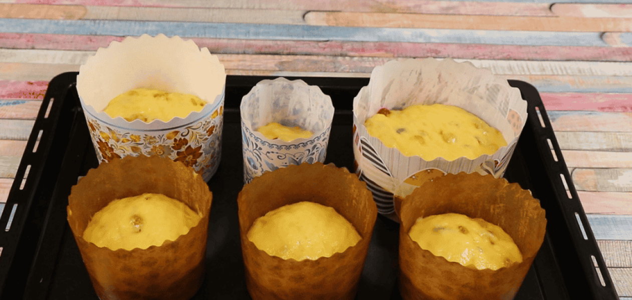 Стіл і руки рясно змащуємо олією. Паперові форми змащуємо олією. Викладаємо тісто та ділимо його на частини. Виходить 1форма d 11 см – 400 г тіста; 3 форми d 9 см – 250 г тіста; 1 форма d 7 см, висота 8,5 см – 150 г тіста. Якщо немає ваги, тісто заповнюємо на половину форми.
