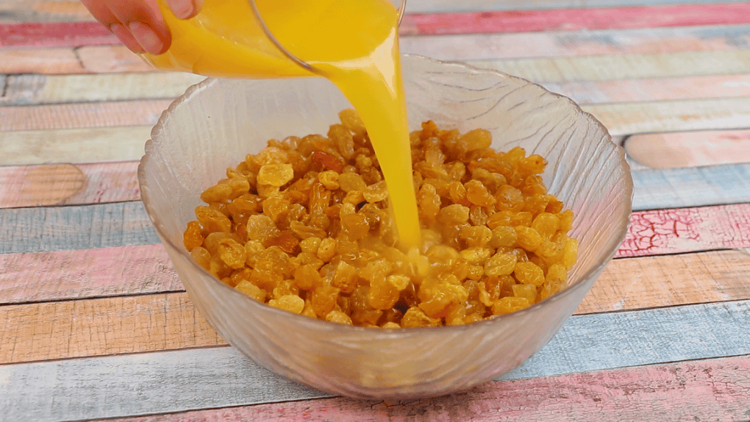 Також, увечері замочуємо родзинки. 250 г промитих родзинок заливаємо 170 г свіжого апельсинового соку. Залишаємо постояти ніч.